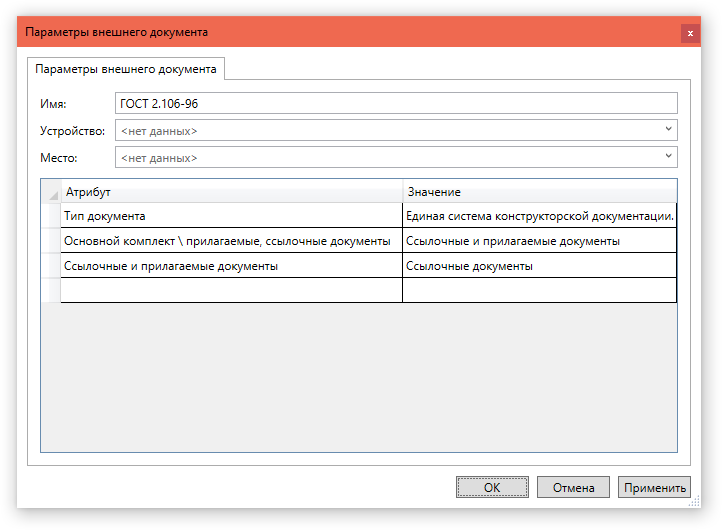 Для удобства пользователей, в функционал E3.Instrumentation добавлено окно «Параметры внешнего документа». Оно необходимо для быстрого (прямого) задания атрибутов внешним документам включенным в проект.